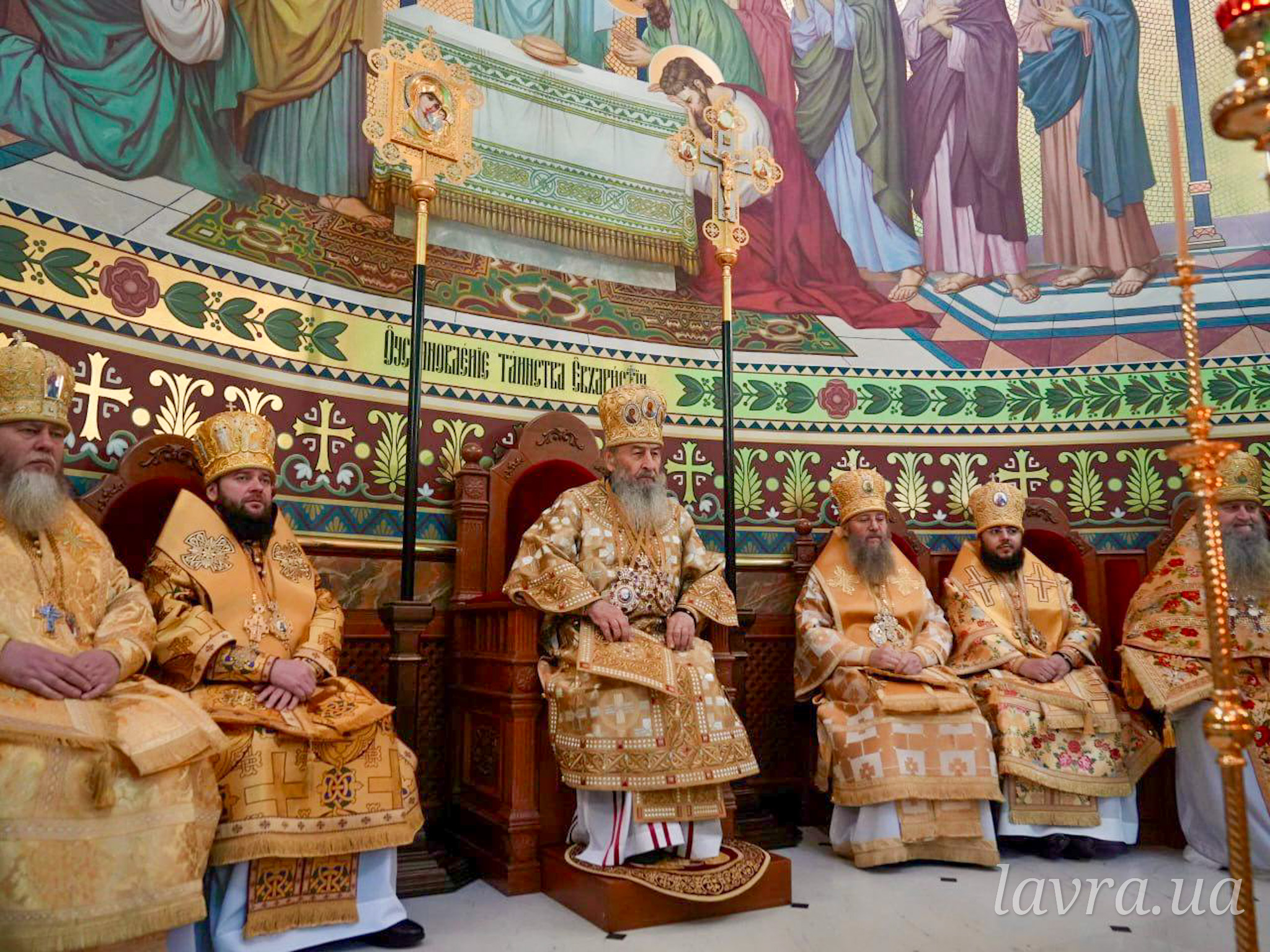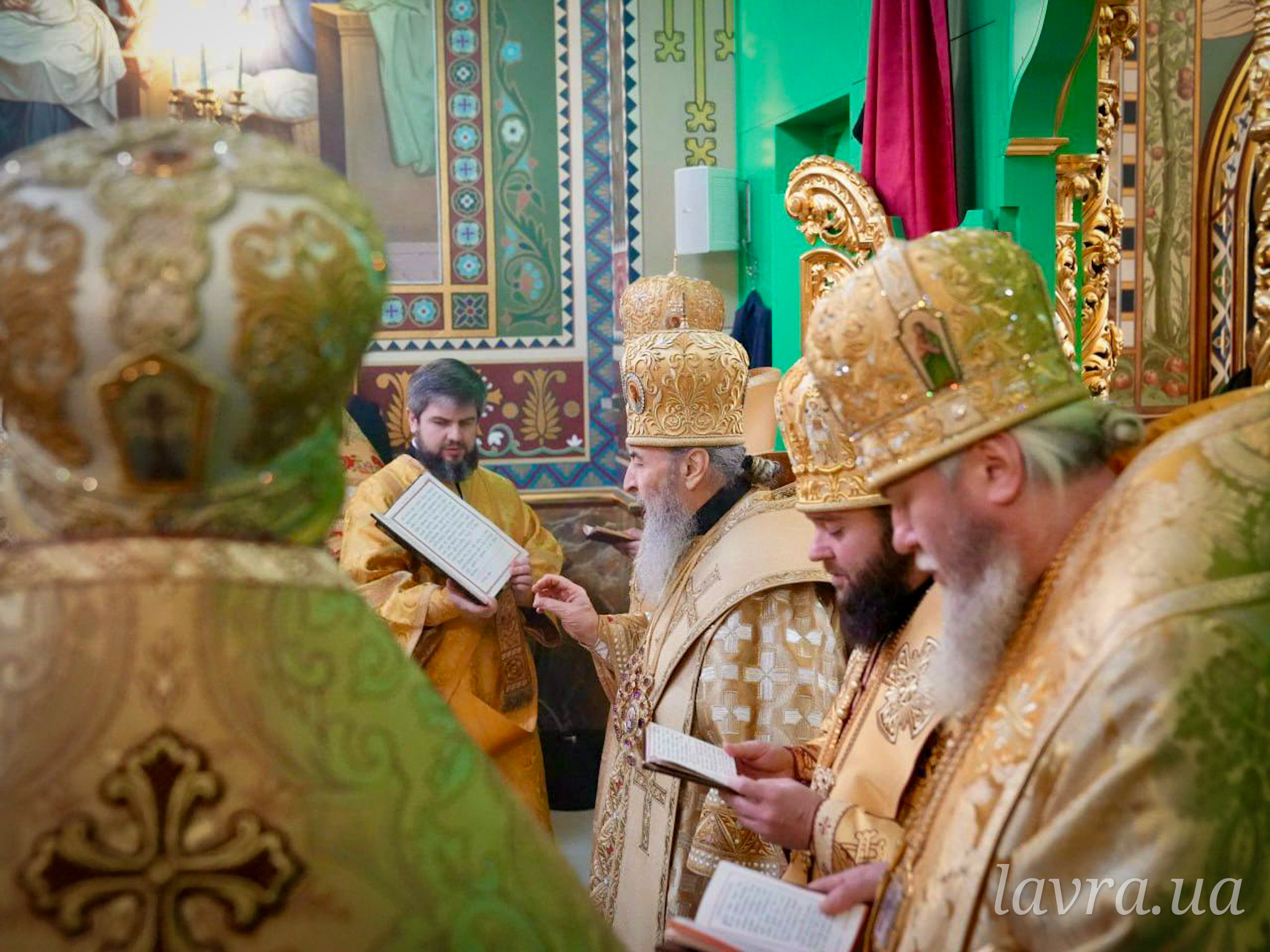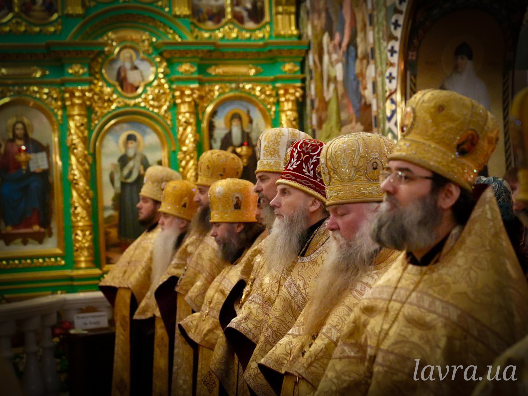 Во время богослужения Предстоятелю Украинской Православной Церкви сослужили управляющий делами УПЦ митрополит Бориспольский и Броварской Антоний, архиепископ Ирпенский Лавр, архиепископ Бородянский Марк, архиепископ Бышевский Кирилл, а также братия и гости обители в священном сане во главе с духовником Лавры архимандритом Антонием.
