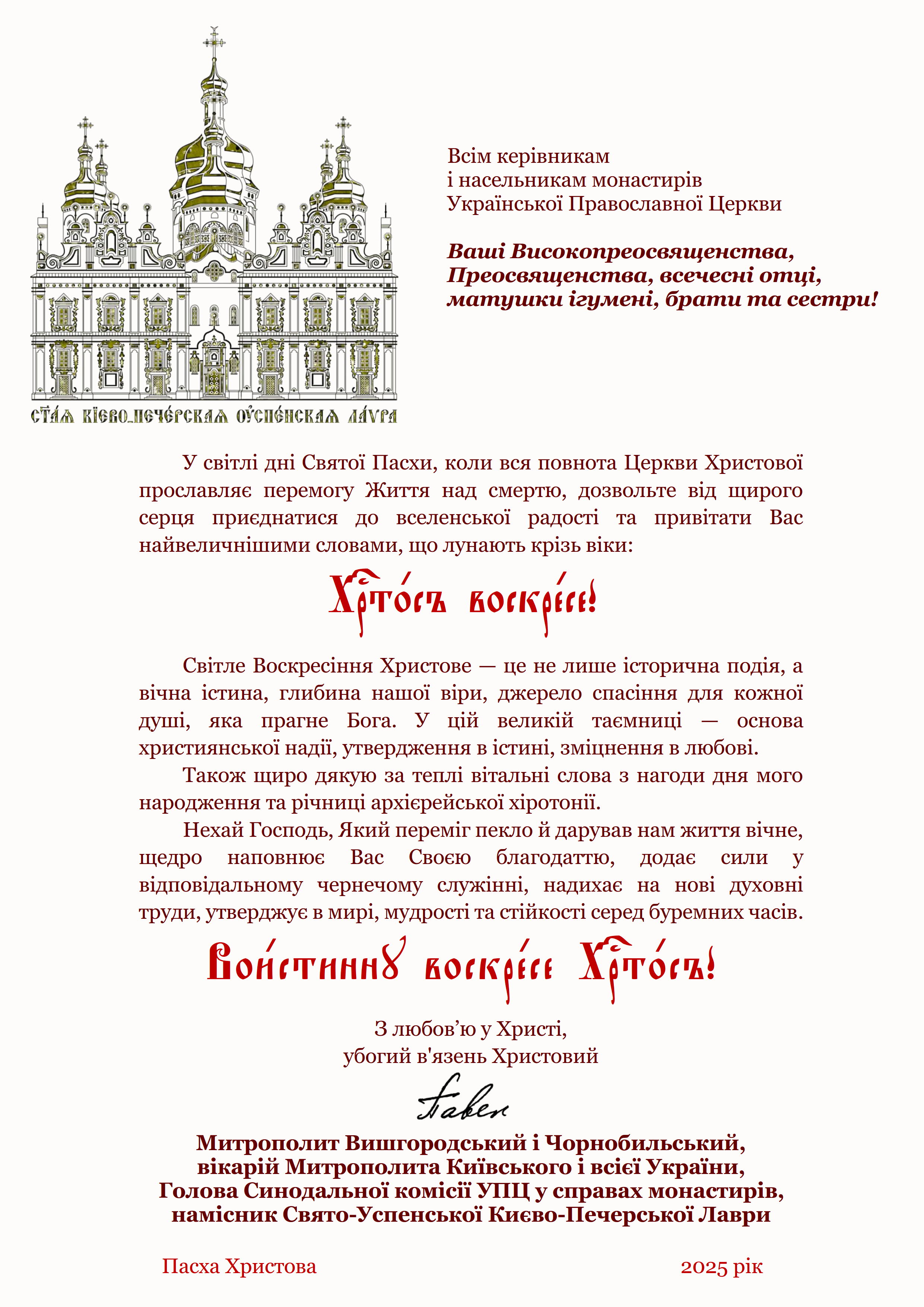 Всім керівникам і насельникам монастирів Української Православної Церкви