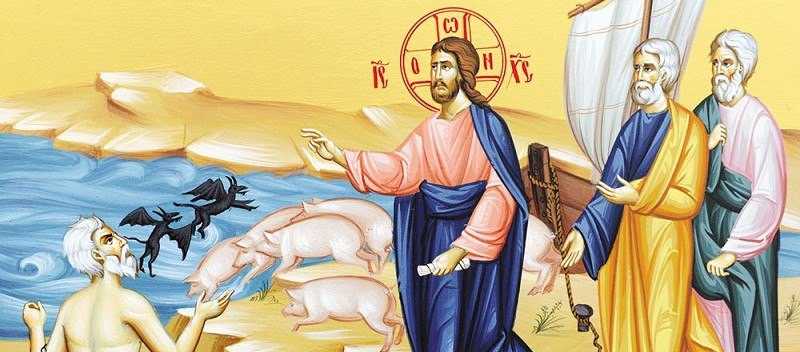 Уже одно присутствие воплотившегося Сына Божьего жгло и терзало бесов огнем божественной Любви, которого они не выносят. И далее читаем: «ибо Иисус повелел нечистому духу выйти из сего человека, потому что он долгое время мучил его». Господь повелел бесам выйти и отправится, по-видимому, в преисподнюю, в место их обиталища. «И они просили Иисуса, чтобы не повелел им идти в бездну. Тут же на горе паслось большое стадо свиней; и бесы просили Его, чтобы позволил им войти в них. Он позволил им». Бесы просят Господа не лишать их возможности действовать в той стране.