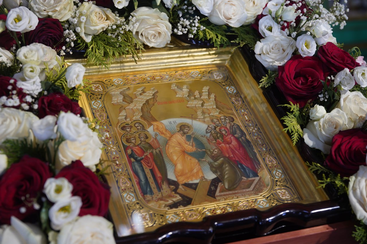Во время полиелея согласно с уставными особенностями праздника вместо пения обычных воскресных тропарей «Ангельский собор…» пелось величание Воскресшему Христу: «…нас ради во ад сшедшаго и с Собою вся воскресившаго».