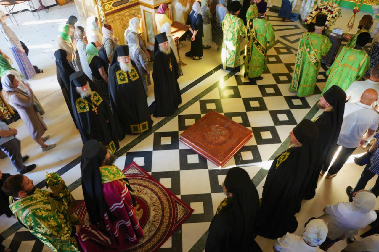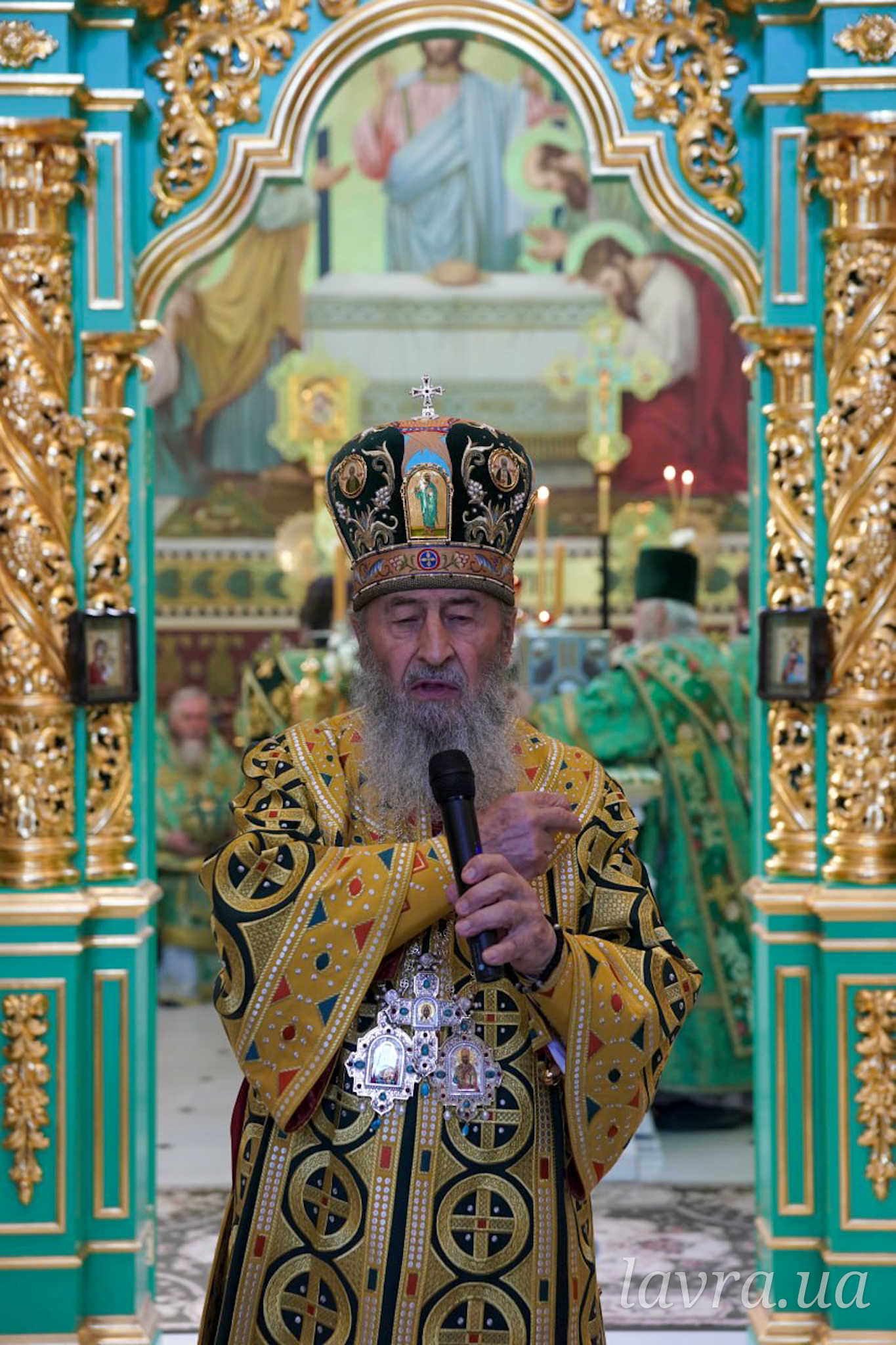 После чтения Евангелия Первосвятитель обратился к пастве с архипастырским словом, напомнив о подвиге угодников Божиих, почивающих в Дальних пещерах Лавры.