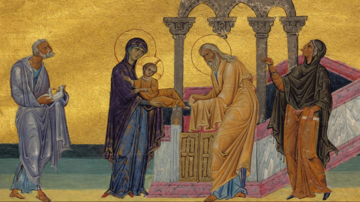 На сороковий день після Різдва Христового Пресвята Діва Марія за законним звичаєм принесла до храму Свого Божественного Немовляти. Там, у храмі, зустрів Його старець Симеон, взяв Його на руки, благословив Бога і сказав: