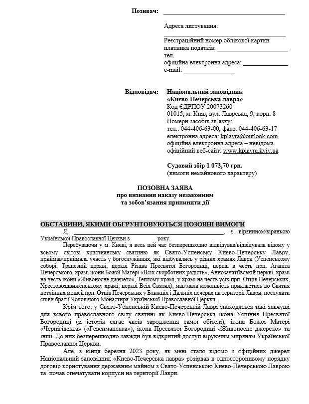 - Позов подається до Печерського районного суду м. Києва (вул. Володимирська, 15, м. Київ, 01601).